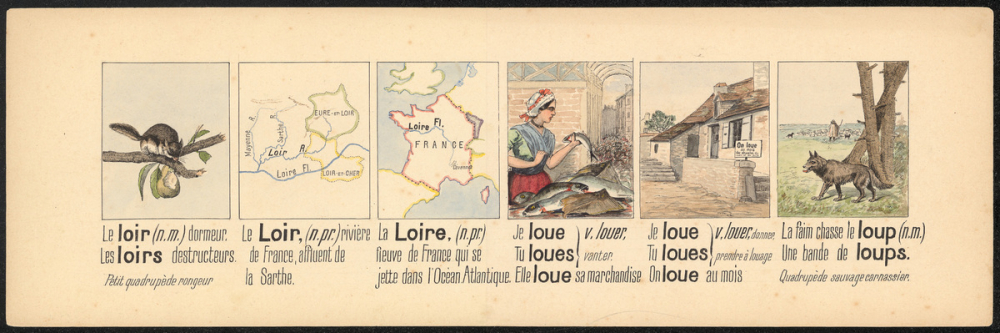 Représentations : loir, La Loire, poissonnier, location, loup / Les vignettes illustrent dans l'ordre suivant : le loir dormeur ; le Loir, rivière de France ; la Loire, fleuve de France ; je loue ; la faim chasse le loup.