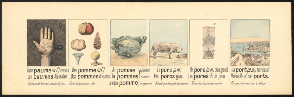 Représentations : main, pomme, pomme de pin, pomme de terre, chou, porc, bassin portuaire / Les vignettes illustrent dans l'ordre suivant : une paume ouverte ; une pomme ; je pomme ; le porc ; un pore très grossi ; un port marchand.