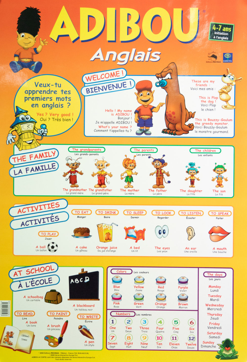 Notes : Poster Adibou destiné aux 4-7 ans. Initiation à l'anglais. Vocabulaire basique en français et en anglais, avec les illustrations correspondantes. Rubriques : welcome, the family, activities, at school, colors, numbers, the days.