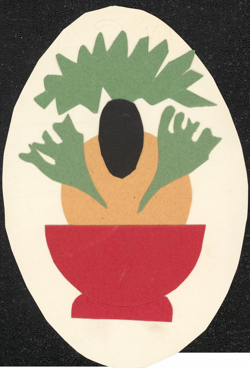 Représentations : plante / Sur une feuille de papier blanc en forme d'œuf, deux papiers rouges sont collés en bas pour figurer un pot de fleur. Au milieu est collé un rond beige, sur lequel sont ajoutés un morceau de papier noir de forme ovale et trois morceaux de papier verts découpés en dents de scie irrégulières.