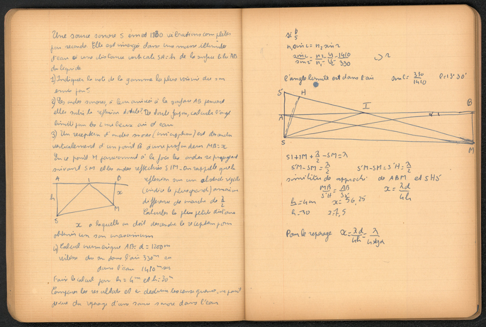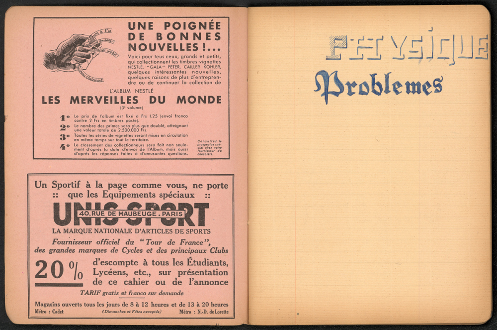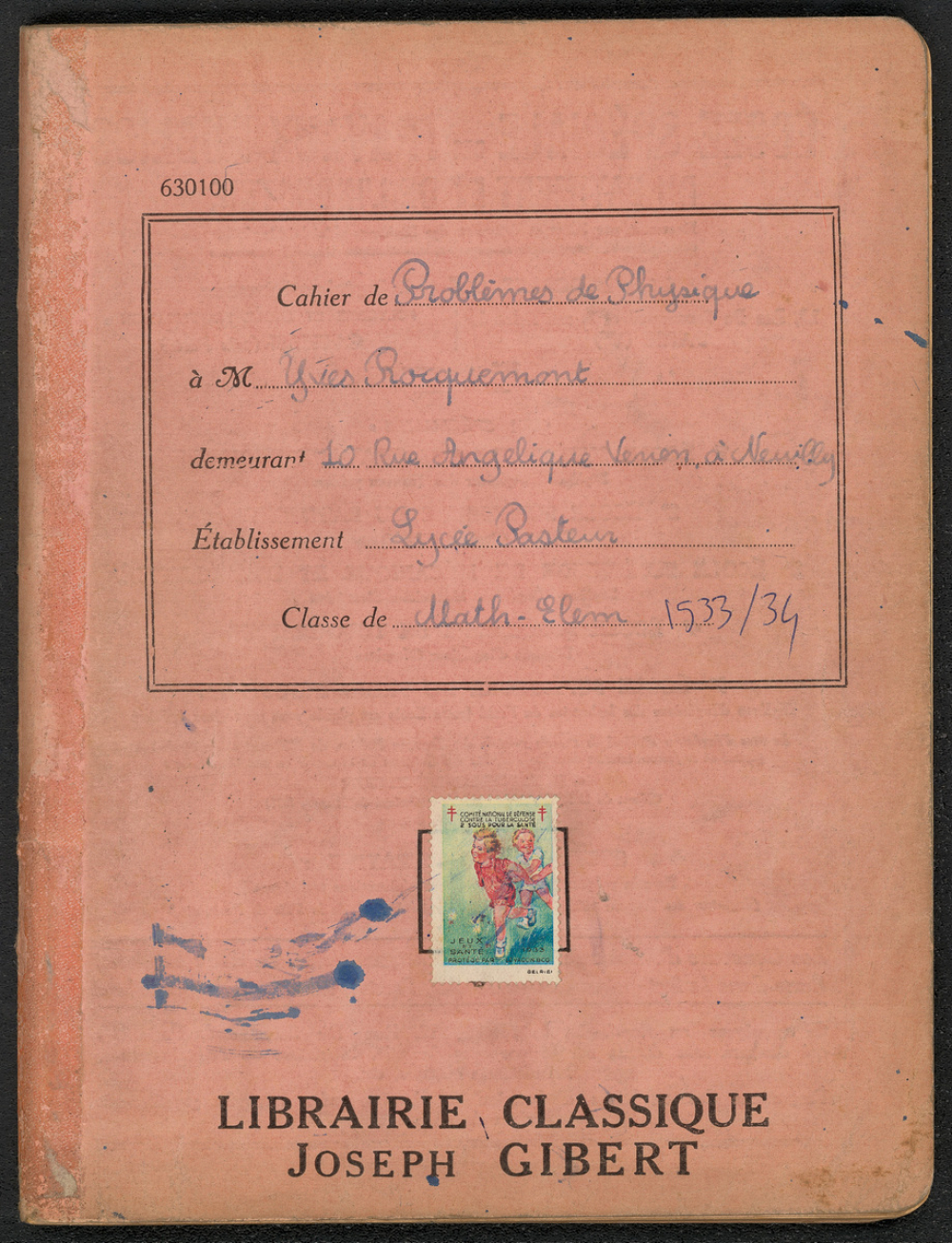 Notes : Il s'agit du cahier de Science-Physique d'Yves Rocquemont, élève scolarisé au Lycée Pasteur de Neuilly-sur-Seine en classe de Mathématiques élémentaires (Terminale), durant l'année 1933-1934.