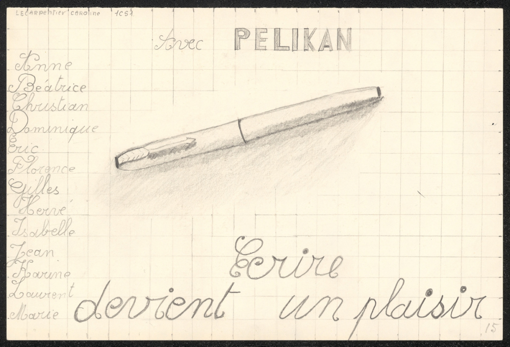 Représentations : publicité / Un stylo est représenté au milieu de la feuille, avec un dégradé de coloriage créant un ombrage. Des carreaux réguliers représentent une feuille d'écriture. Par ailleurs, de nombreuses inscriptions sont présentes : la première "Avec PELIKAN Ecrire devient un plaisir", est écrite en partie en haut de la feuille, et en partie en bas. À gauche, une liste de prénoms est écrite en suivant les carreaux de la feuille : "Anne, Béatrice, Christian, Dominique Eric, Florence, Gilles, Hervé, Isabelle, Jean, Karine, Laurent, Marie." Les inscriptions sont principalement en écriture attachée.