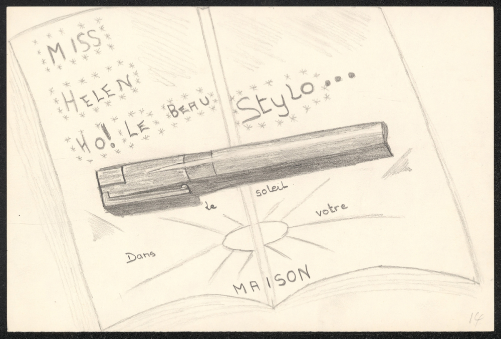 Représentations : publicité / Représentation d'un cahier ouvert sur lequel figure deux inscriptions : la première est "Miss Helen Ho ! Le beau stylo...". L'inscription est écrite principalement en lettres capitales, et entourée d'astérisques en guise de décoration. La deuxième inscription est "Le soleil Dans votre MAISON". Au milieu de celle-ci est justement représenté un soleil. Au milieu de la feuille est représenté un stylo posé sur le cahier, et qui en prend quasiment toute la largeur. L'ombre du stylo est également représentée par un épais coloriage.