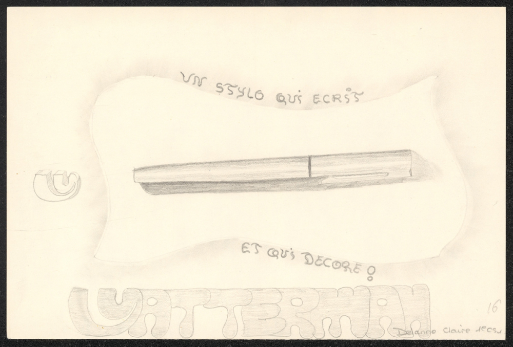 Représentations : publicité / Un stylo est représenté au centre de la feuille, sur une partie laissée blanche alors que le reste est légèrement grisé au crayon. Un slogan est écrit au-dessus et en-dessous "Un stylo qui ecrit et qui décore !". En bas est écrit en grosses lettres coloriées "WATTERMAN". Le W est de plus représenté à gauche du stylo.