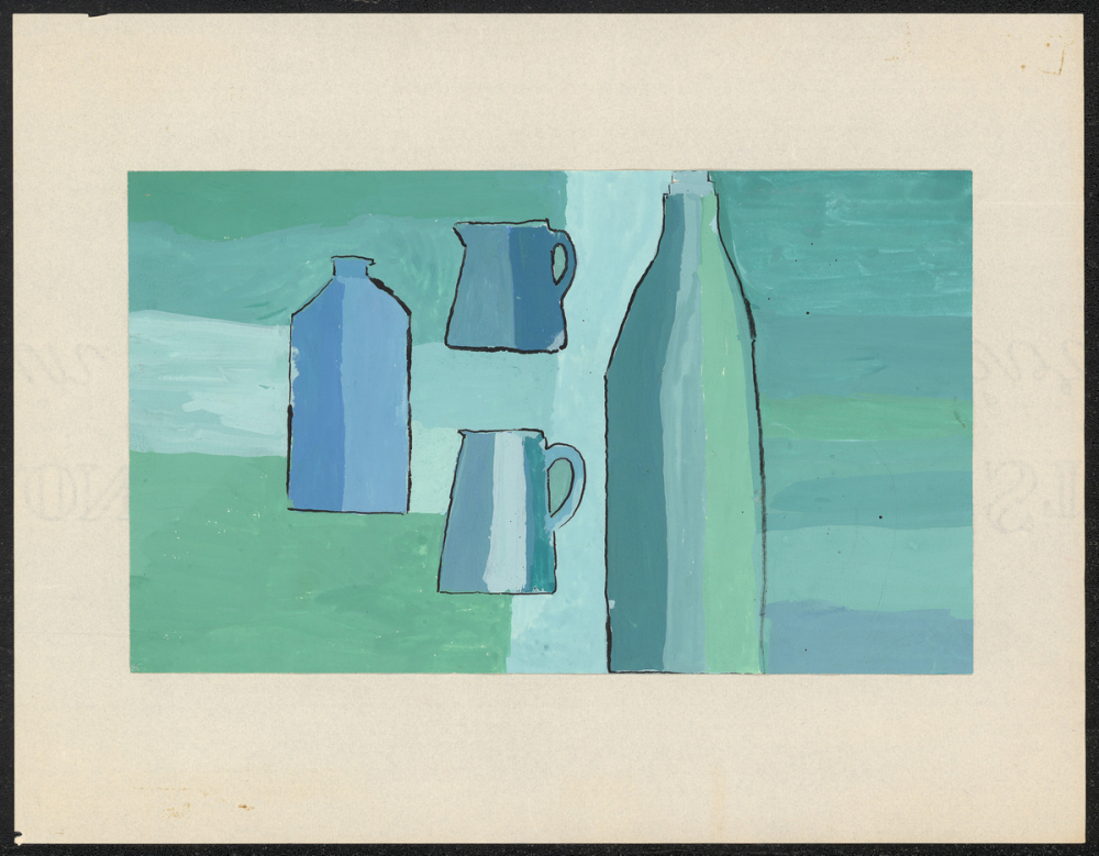 Représentations : récipient de cuisine / Quatre récipients sont représentés : à gauche, une bouteille de deux nuances de bleu et de petite taille ; au milieu deux carafes, une petite en haut de deux nuances de bleu, une grande en bas bleue, blanche, et verte ; à droite une grande bouteille prenant toute la hauteur de la feuille, qui est bleue, grise, et verte. Elles sont délimitées par des traits de feutre noir. Le reste de l'espace est peint de différentes nuances de blanc, gris, vert, et bleu.