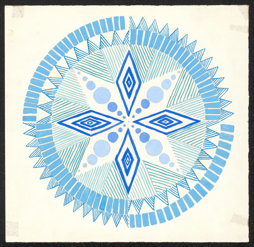 Historique : Ce dessin appartient à une série de travaux d'élèves conservés à l'origine par la professeure d'éducation artistique de l'École technique puis Lycée technique Jeanne d'Arc, à Sainte-Adresse (76), réalisés entre 1958 et 1985. Il faisait partie d'un lot intitulé : couleurs décor sur des formes variée.