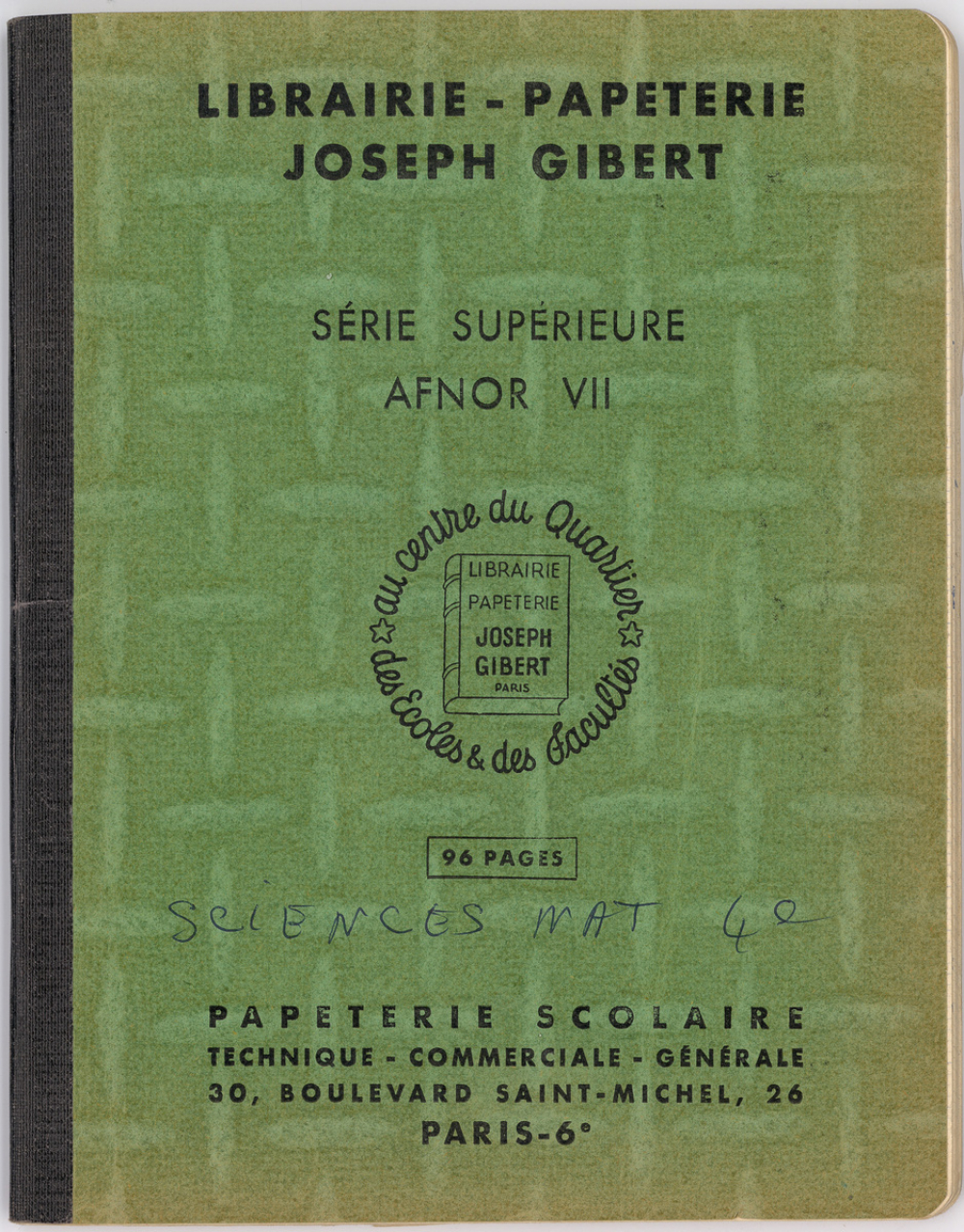 Description : Couverture en papier épais vert à dos toilé synthétique noir. Reliure cousue. Réglure Séyès carreaux 8 x 8 mm avec marge rose.