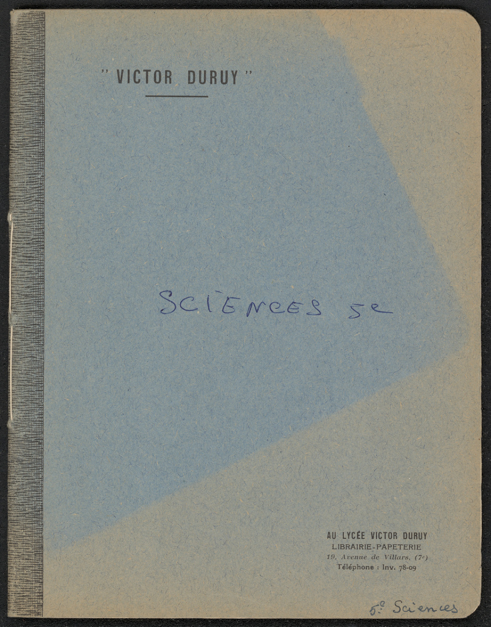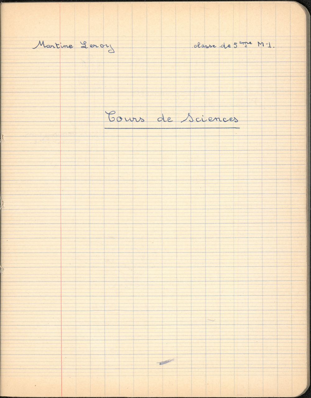 Notes : Cahier de sciences de Martine Leroy-Bouveyron (née Leroy) alors âgée de 12 ans, élève de 5e M1, au Lycée Victor Duruy à Paris (VIIe arrondissement), durant l'année 1959-1960.