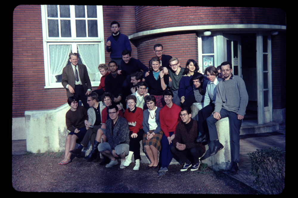 Représentations : portrait collectif : être humain / Un groupe d'environ vingt-trois personnes pose devant un bâtiment en brique.