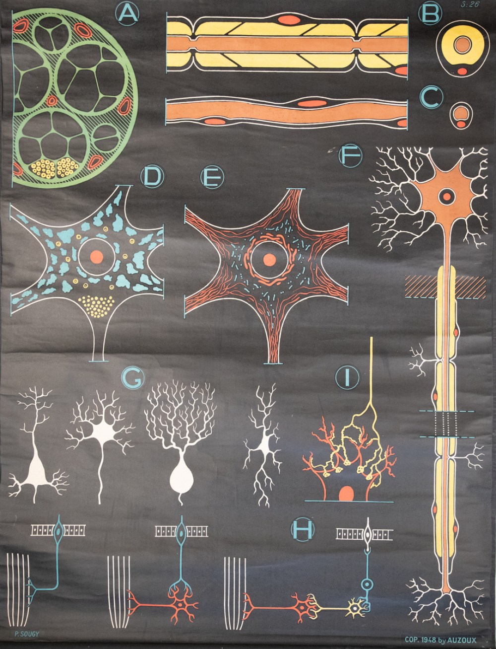 Description : Grande planche murale de sciences naturelles illustrée en couleurs sur fond noir, imprimée sur papier glacé épais avec baguettes en bois en haut et en bas de la planche munie d'un ruban de suspension et entoilée au dos.