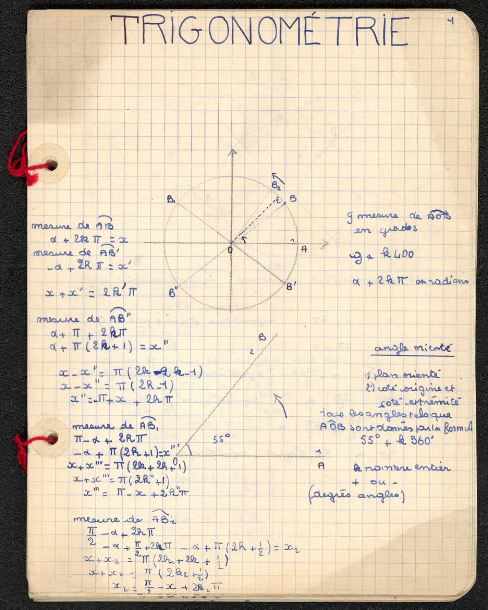 Notes : Il s'agit du cahier de Trigonométrie de Marie-France Rocquemont (épouse Morel), élève alors scolarisée au lycée Marie Curie de Sceaux (Hauts de Seine, ex-Seine) en classe de Terminale série Mathématiques élémentaires, durant l'année 1958-1959.