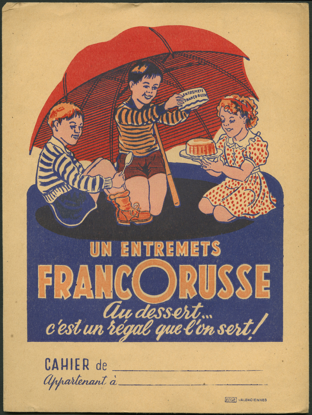 Notes : Recto : sous un grand parasol rouge trois enfants s'apprêtent à déguster un entremets qui vient d'être démoulé.