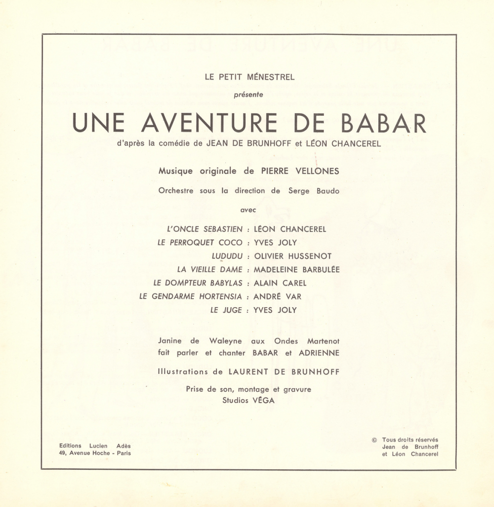 Notes : (1)Livre. Mention page de titre : Janine de Waleyne aux Ondes Martenot fait parler et chanter Babar et Adrienne. Page de garde collée au plat supérieur à l'envers. Elle contextualise "ce divertissement poétique et burlesque en 3 actes".