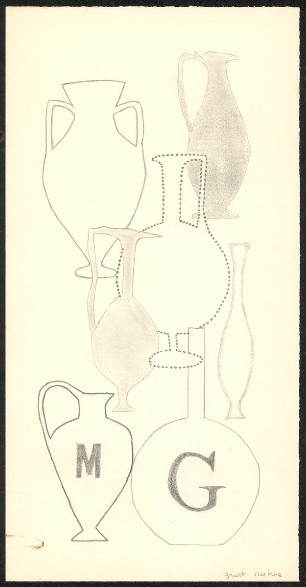 Représentations : vase / Représentation de sept vases grecs de différents types et de différentes tailles. Certains sont coloriés, d'autres non. Dans l'un d'entre eux est écrit en gros la lettre M, et dans un autre la lettre G, correspondant aux initiales de l'élève.