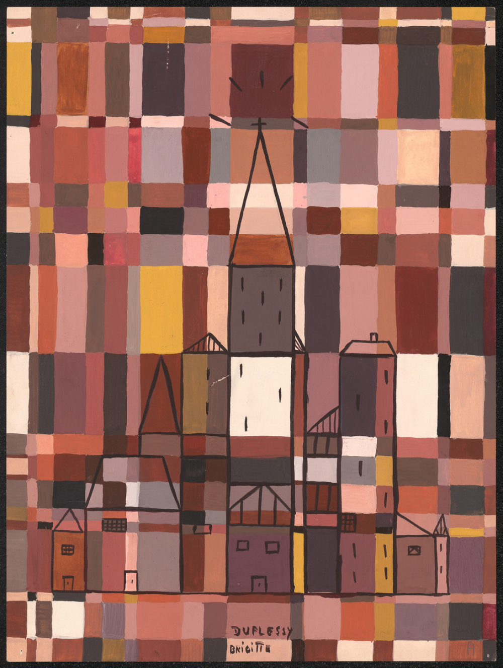Représentations : village, quadrilatère / La feuille est entièrement peinte d'une multitude de couleurs (beige, marron, noir, gris, rouge, jaune, orange, blanc, violet, rose), délimitées dans un quadrillage de rectangles de différentes formes et de différentes tailles. Un village est dessiné exclusivement au feutre noir en reprenant partiellement les délimitations des rectangles, et en ajoutant quelques traits. Le village est globalement de forme triangulaire, et est dominé par un clocher d'église surmonté d'une croix, mise en valeur par des traits noirs qui l'entourent. Les maisons sont de différentes formes et de différentes tailles, et se confondent parfois. Les fenêtres peuvent être ou des rectangle quadrillés ou de simples traits verticaux.