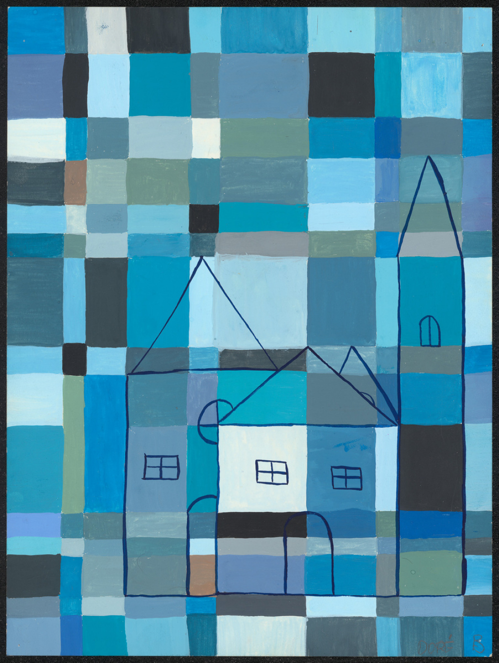 Description : Sur un fond peint de différentes couleurs sous forme de quadrilatères est dessiné un village au feutre bleu marine.