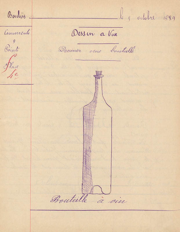 Dessin à vue : bouteille à vin, octobre 1889. In : Cahier de compositions, cours élémentaire - cours moyen, école de garçons de Méry-Corbon (Calvados)